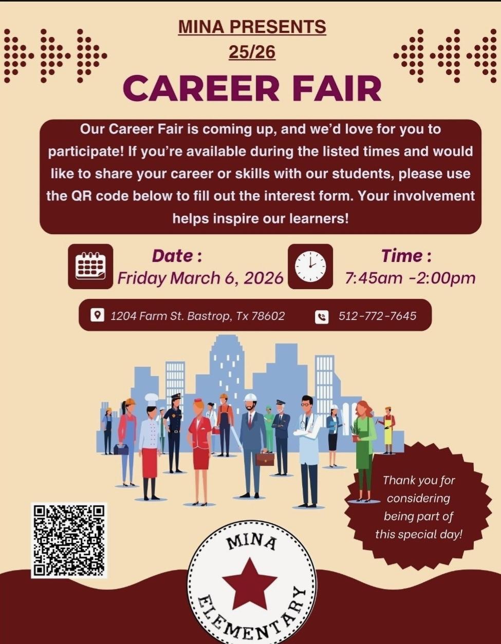 Mina Elementary, the Club's adopted BISD school, is holding a Career Fair on March 7, 2026. You still have time to volunteer for this event. See the attached flyer for more information.