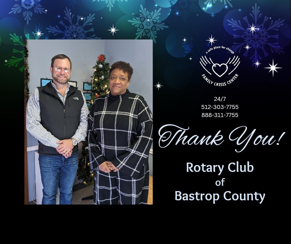 From Sherry Murphey, the Director of Family Crisis Center in Bastrop "On behalf of our staff, board, and most importantly, the individuals we serve, I extend our sincerest appreciation to your organization for this donation. Rotary Club of Bastrop County’s past and ongoing support of the Center is truly appreciated. Please know that your efforts make such a difference in the provision of the vital range of services the Center provides to address and prevent violence and abuse in our community."